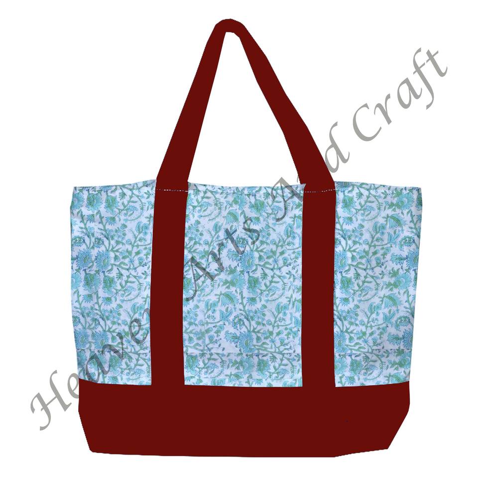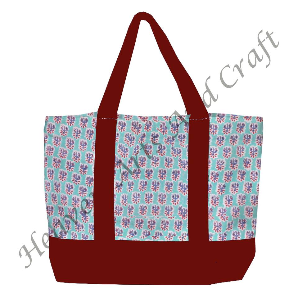 Burgundy Handle Block Printed Tote Shopping Bag India Multi-Hand Floral Design Durable Two Shoulder Straps Wholesale BHCB074