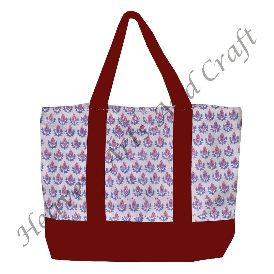 Burgundy Handle Block Printed Tote Shopping Bag India Multi-Hand Floral Design Durable Two Shoulder Straps Wholesale BHCB049