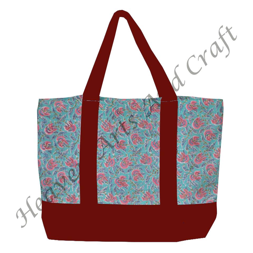 Burgundy Handle Block Printed Tote Shopping Bag India Multi-Hand Floral Design Durable Two Shoulder Straps Wholesale BHCB098