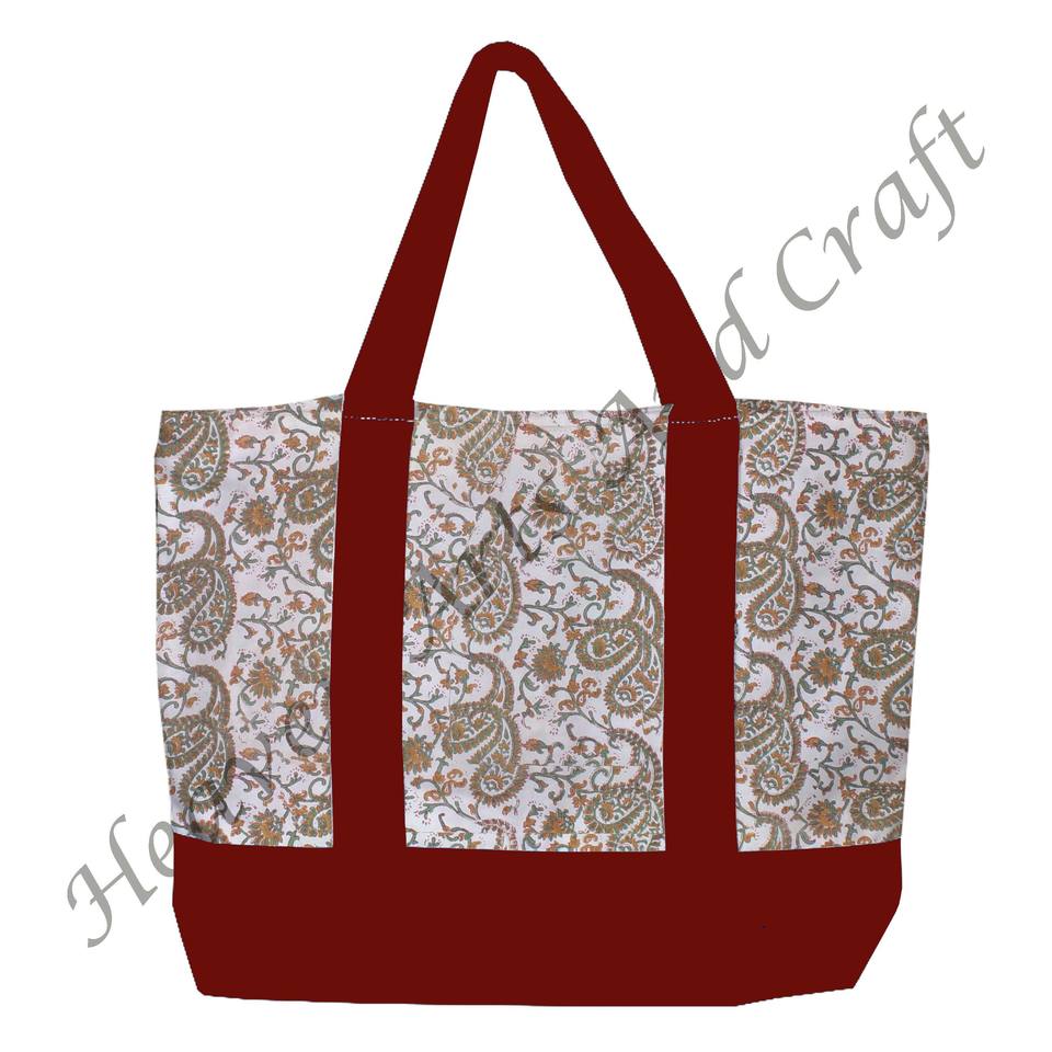 Burgundy Handle Block Printed Tote Shopping Bag India Multi-Hand Floral Design Durable Two Shoulder Straps Wholesale BHCB005