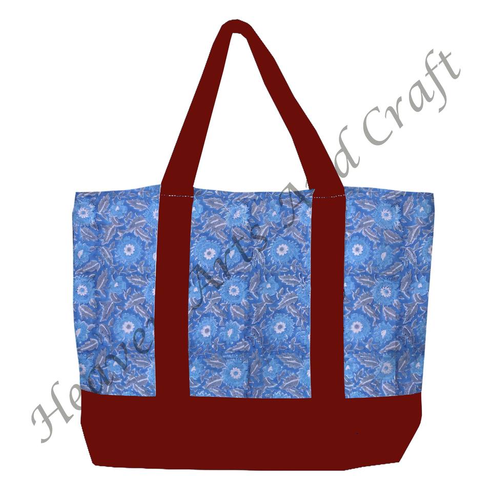 Burgundy Handle Block Printed Tote Shopping Bag India Multi-Hand Floral Design Durable Two Shoulder Straps Wholesale BHCB022