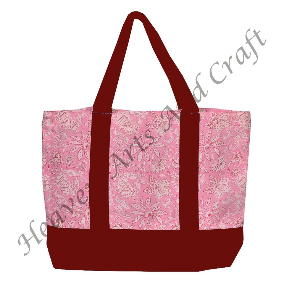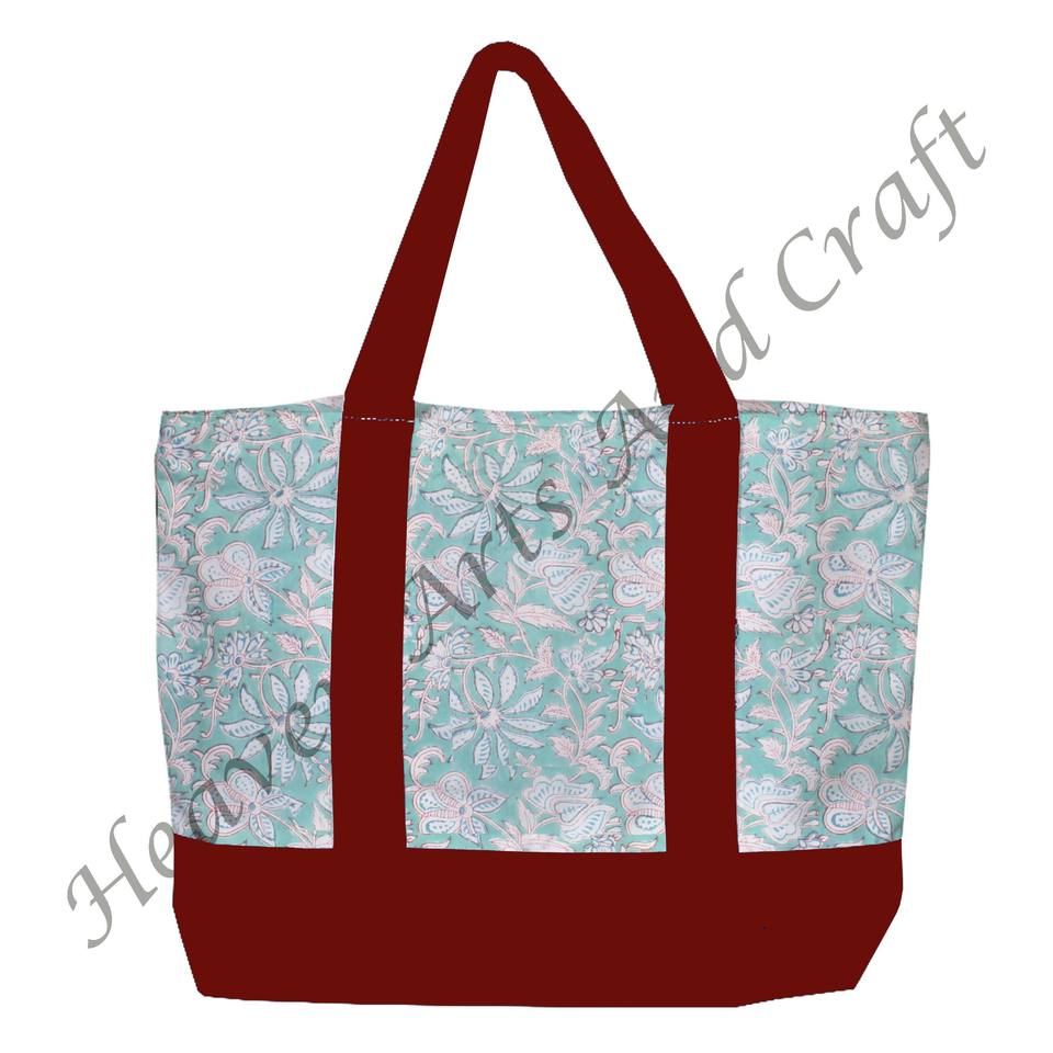 Burgundy Handle Block Printed Tote Shopping Bag India Multi-Hand Floral Design Durable Two Shoulder Straps Wholesale BHCB016