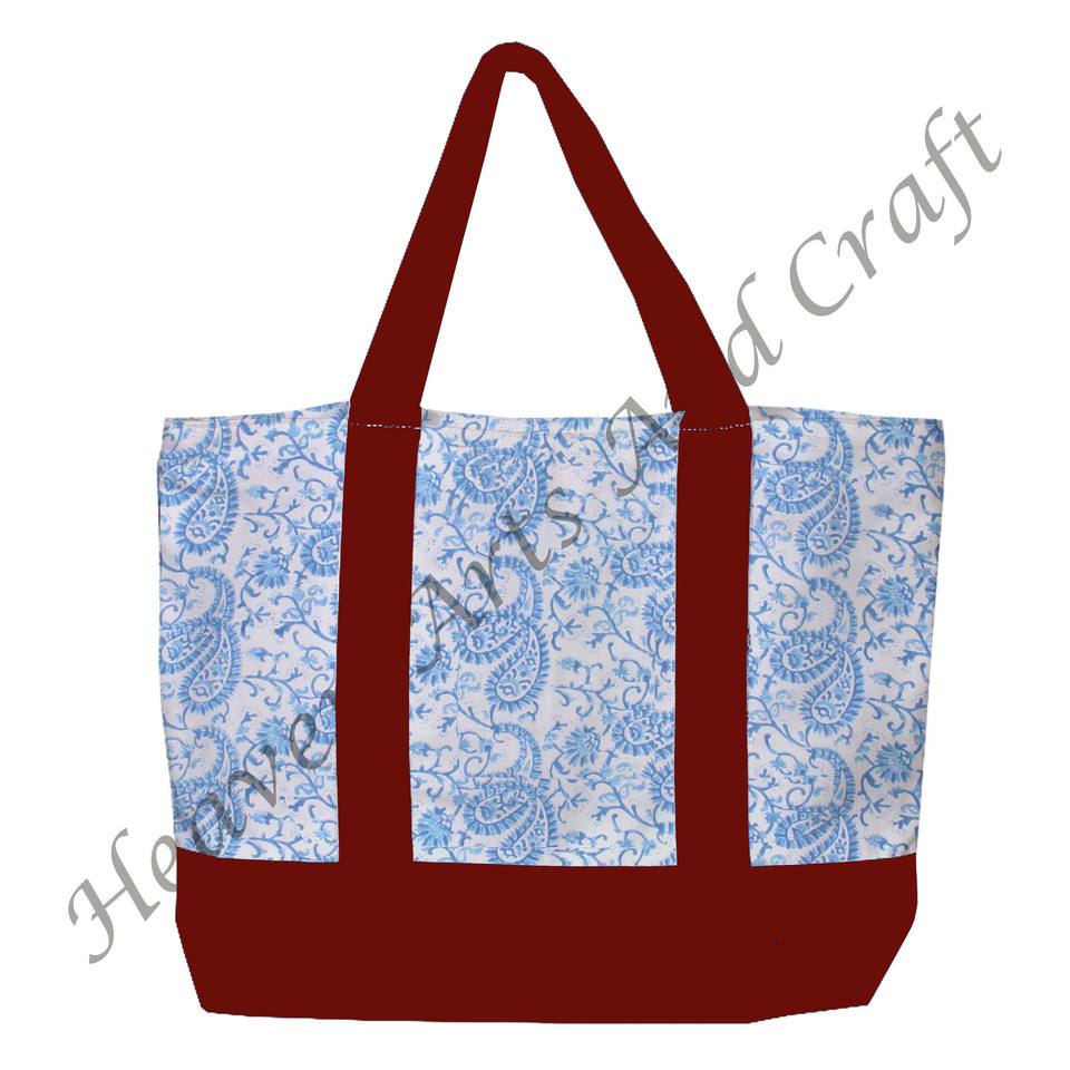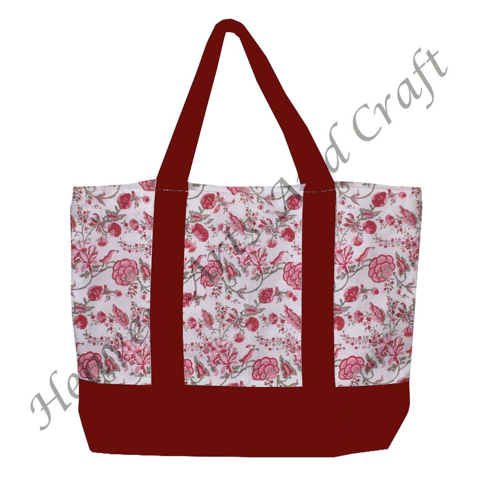 Burgundy Handle Block Printed Tote Shopping Bag India Multi-Hand Floral Design Durable Two Shoulder Straps Wholesale BHCB004
