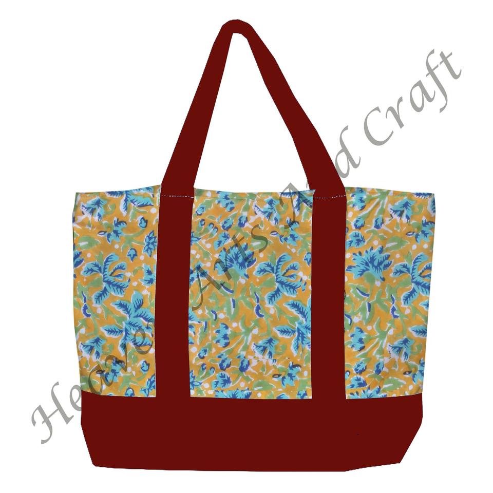Burgundy Handle Block Printed Tote Shopping Bag India Multi-Hand Floral Design Durable Two Shoulder Straps Wholesale BHCB065