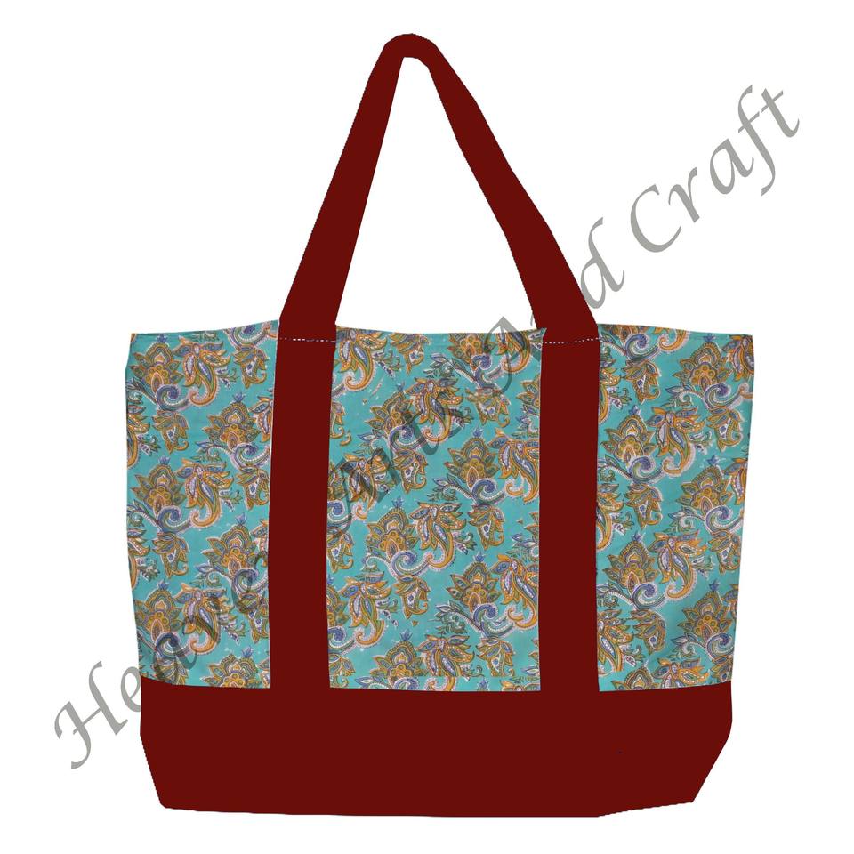 Burgundy Handle Block Printed Tote Shopping Bag India Multi-Hand Floral Design Durable Two Shoulder Straps Wholesale BHCB081