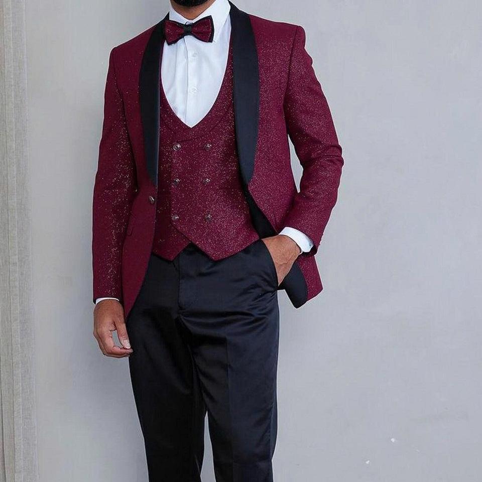 Burgundy Sequin Tuxedo Vest with Glitters Suit Sets 5-piece