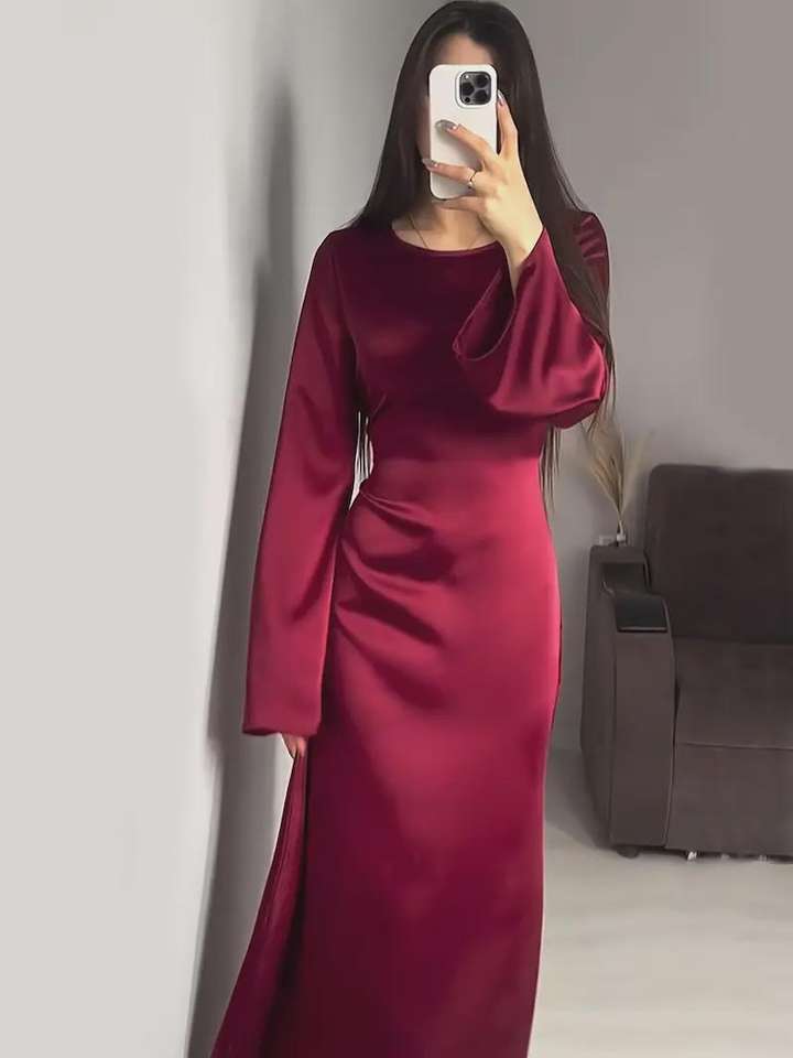 Burgundy Silk Maxi Dress for Women Elegant Long Sleeve Evening Gown Luxury Formal Dress for Weddings Parties & Special