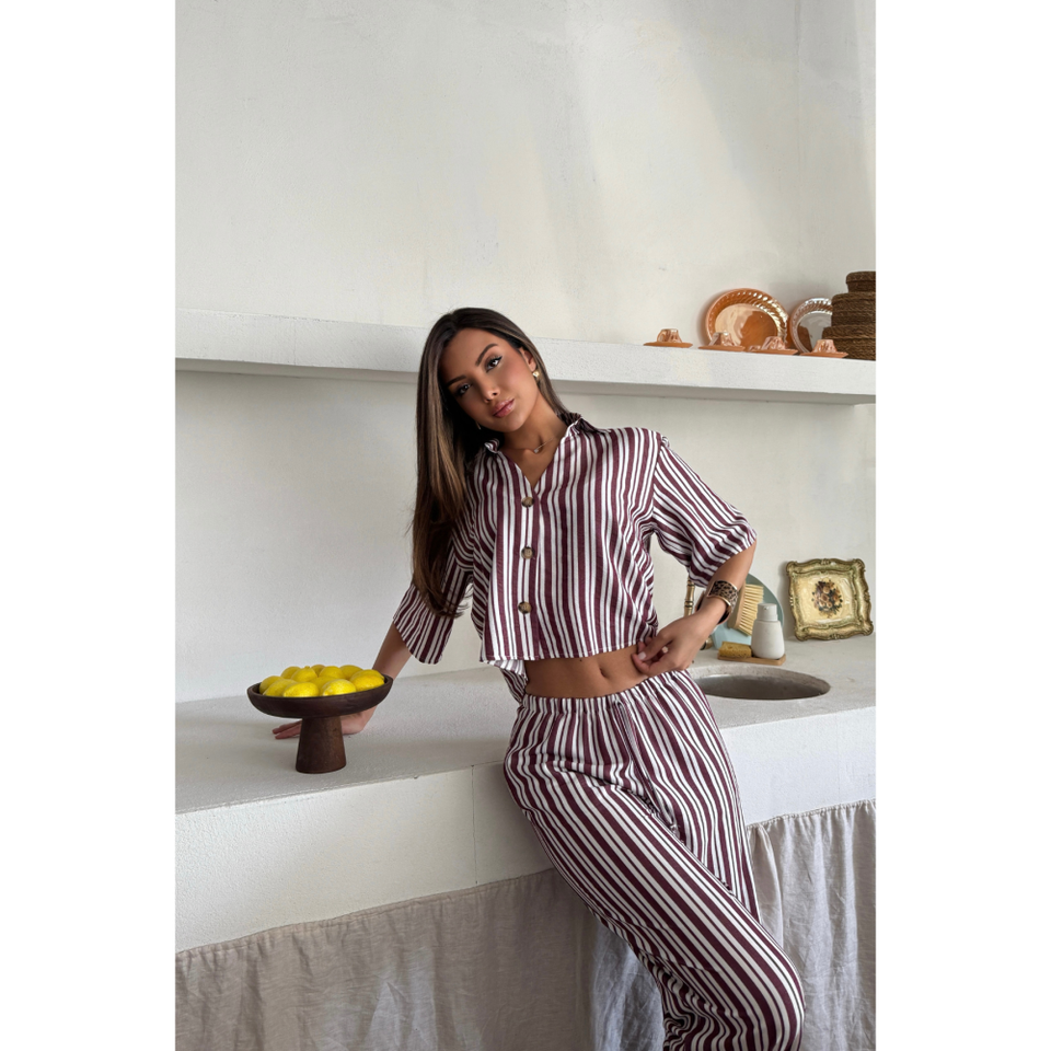 Burgundy Striped Crop Top and Loose-Fit Trousers Modal Set for Women