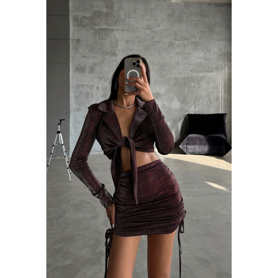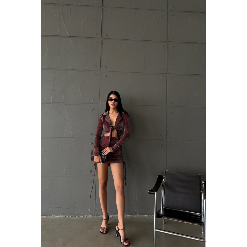 Burgundy Women's Sets Glittery Fabric Crop Blouse with Tie Detail & Short Gathered Skirt