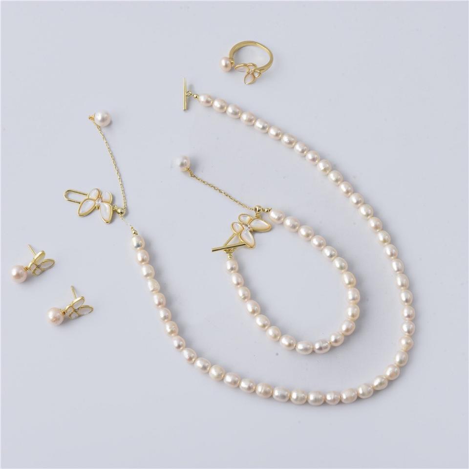 Butterfly Love Full Set Beimu Freshwater Pearl Necklace Bracelet Silver Needle Earrings Open Ring-Versatile Accessories