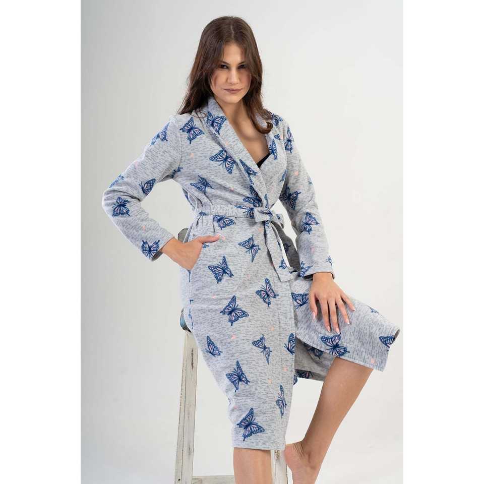 Butterfly Print Women's Knitted Dressing Gown Long Sleeve Soft Gray Sleepwear Casual Robe