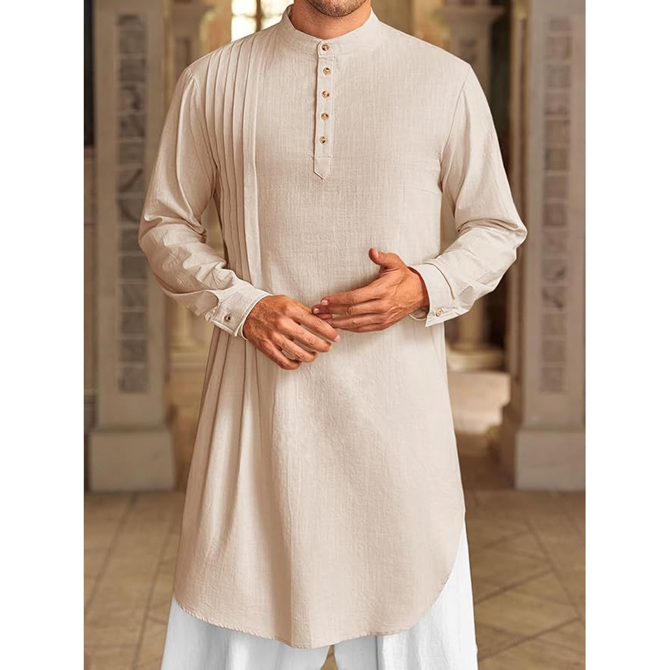 Button Down Long Sleeve Henley Trendy Mens Kaftan Robe Cotton Thobe Casual Side Split Muslim Gown Shirt