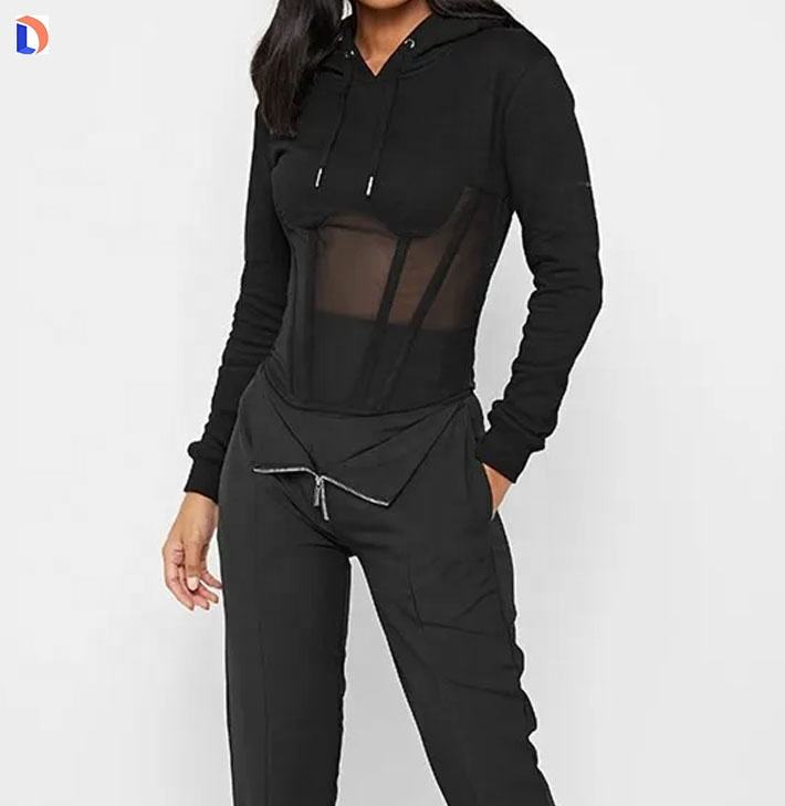Buy Full Black Perspective Hooded Sweater Zip Fastening to Back Corset Feature Jersey