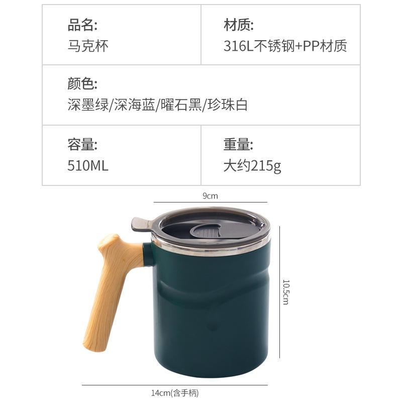 By Wood Grain Handle Mug 316 Stainless Steel Insulated Coffee Cup Round Deep Sea Blue Dark Green Obsidian Black Pearl White