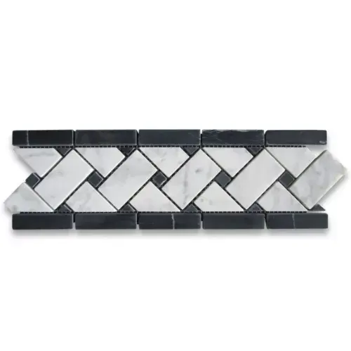C651BXH Carrara Venato Marble Basketweave Mosaic Border 4x12 Black Dots Honed for Prefab Bathroom Units