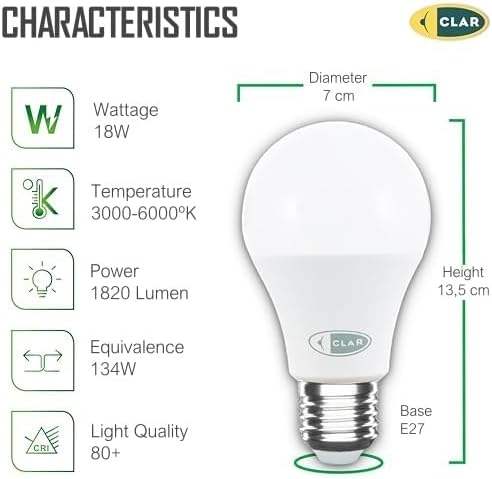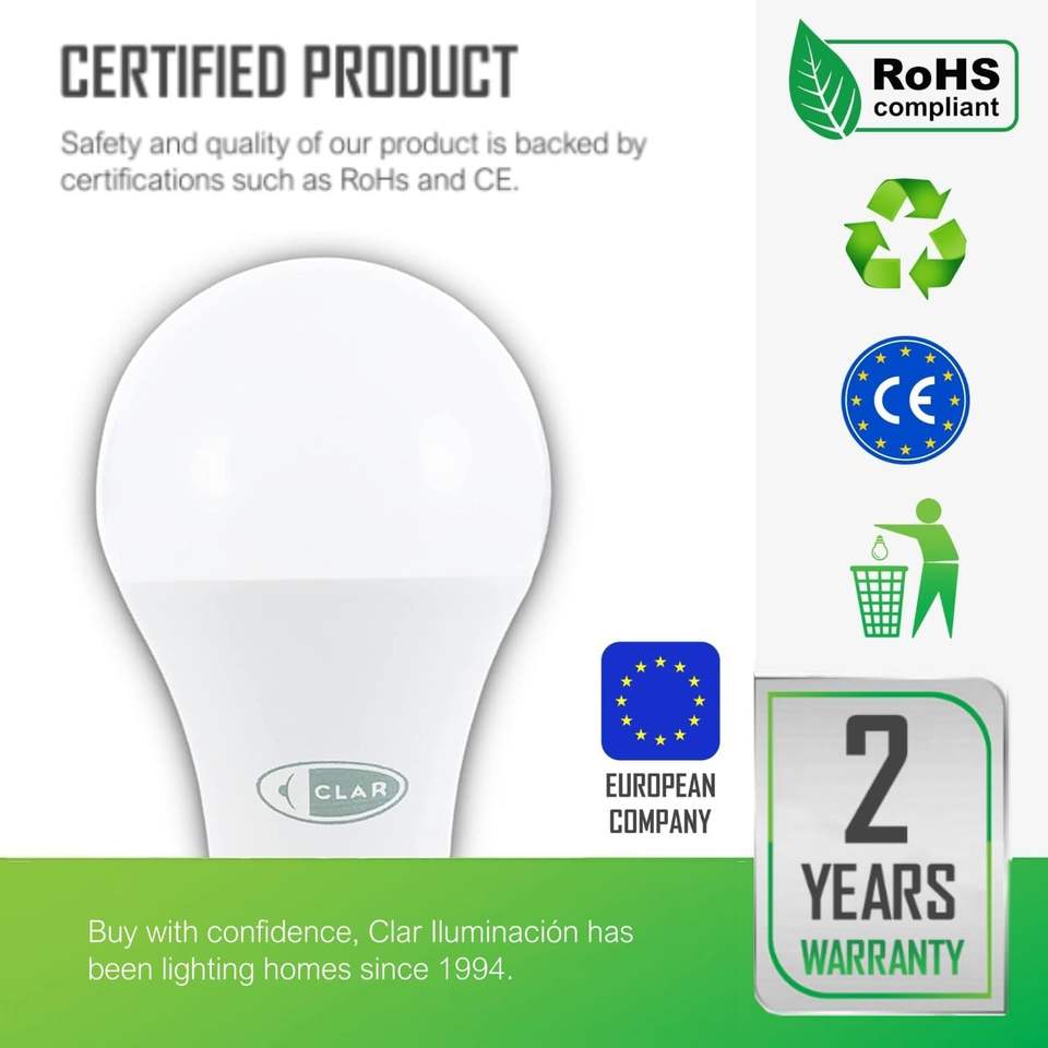 CLAR - Powerful E27 LED Bulb 10W, 15W, 18W, 24W Replaces 120W-150W, Flicker Free, Non Dimmable