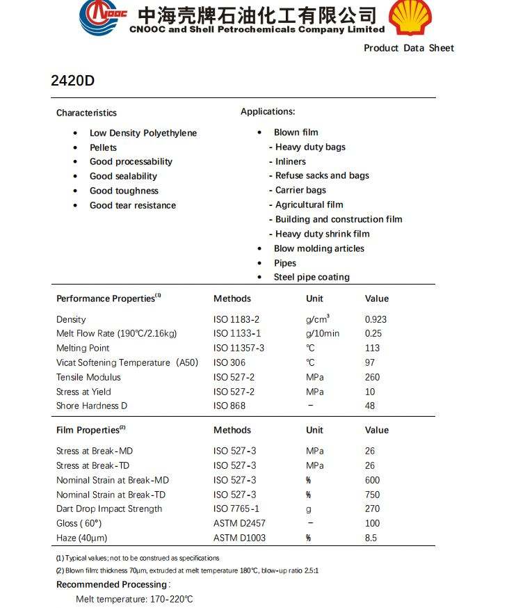 CNOOC Shell LDPE 2420D Virgin Plastic Heavy Duty Bag Pipe Grade Pellets High Flow 25kg/bag Antiblock Film Grade