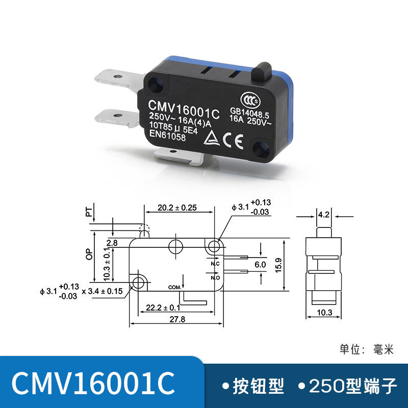CNTD Changde Electric's CMV16001C 16A Push Button Type Miniature Micro Limit Switch 250 Terminal Block Self-Resetting SPDT