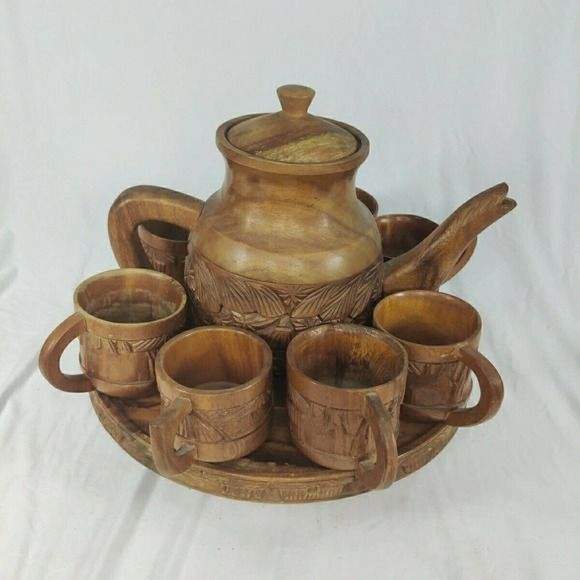 COFFEE WOODEN Nordic Style Coco Palm Wooden Tea Set with Pot and Tray Custom logo Coconut Wood Teapot and Cup Sets