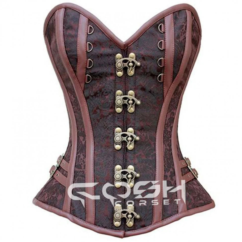 Custom Vintage Brown Jacquard Steampunk Underbust Corset With Brown Leather Boning & Trim Adjustable Front Clasp Closer