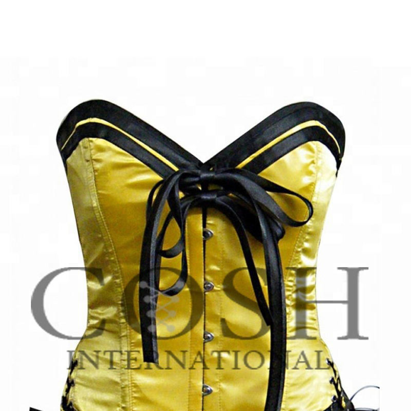 COSH CORSET New Style Overbust Steel Boned Waist Training Yellow Black Satin Corset With Front and Side Hip Ties