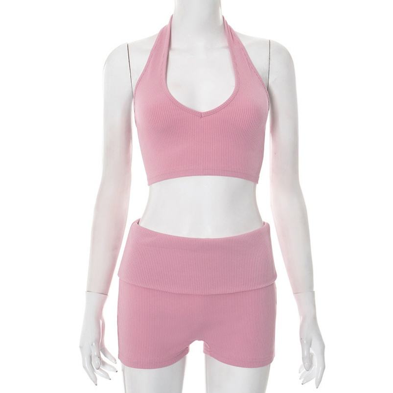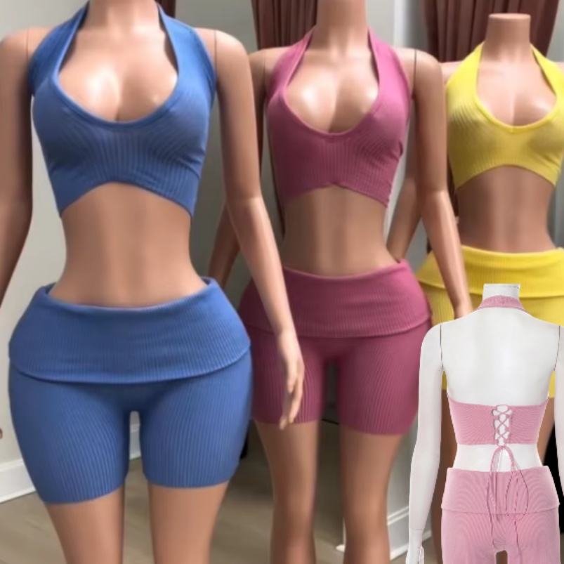 Viviblook D25ST155 Women Solid Color Summer Thread Halter Lace up Tank Top Folding High Waist Shorts Set 2 Piece Suit