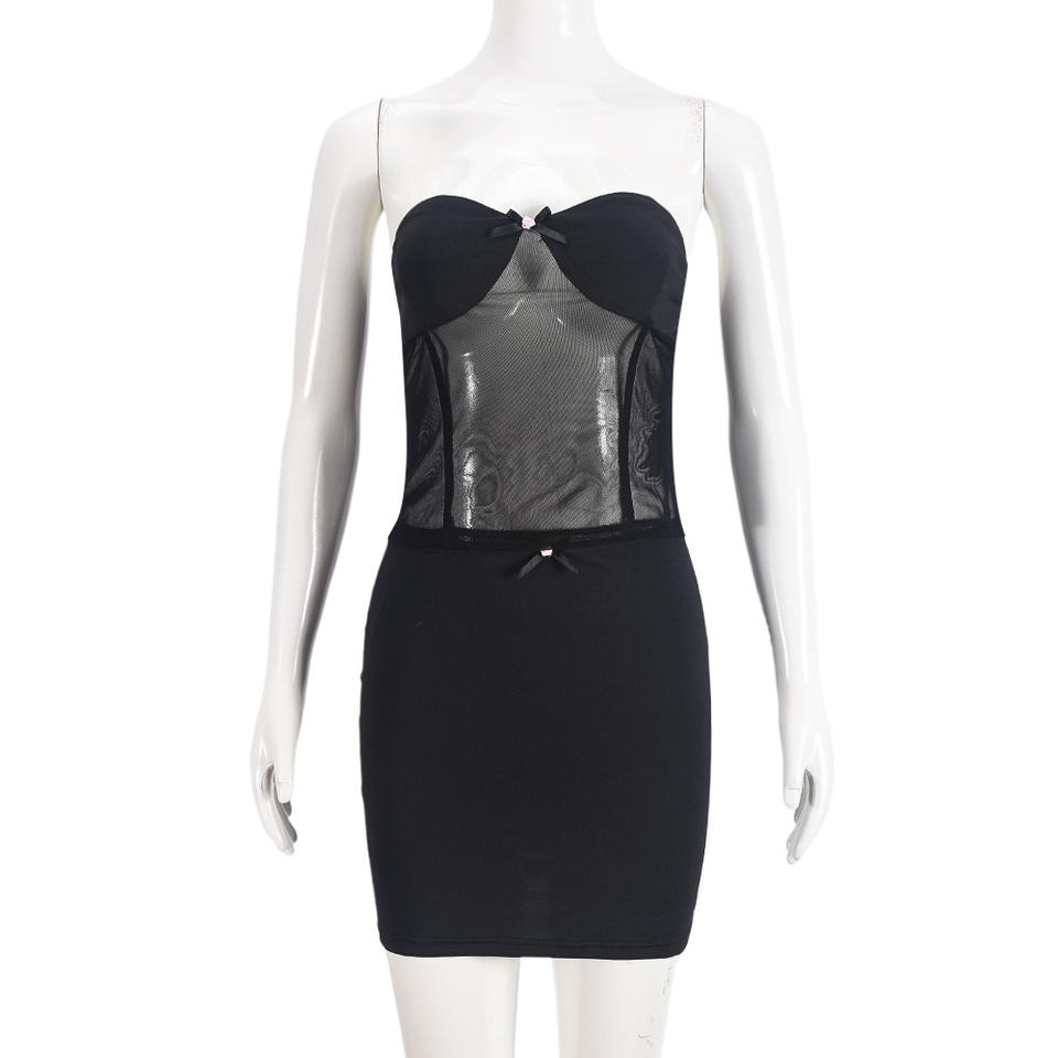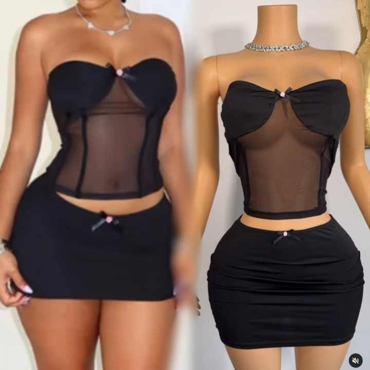 Viviblook Z1106ST06 New Fashion Mesh Patchwork Sexy Outfit Elegant Strapless Tube Top Mini Skirt Suit for Women Two Piece Set