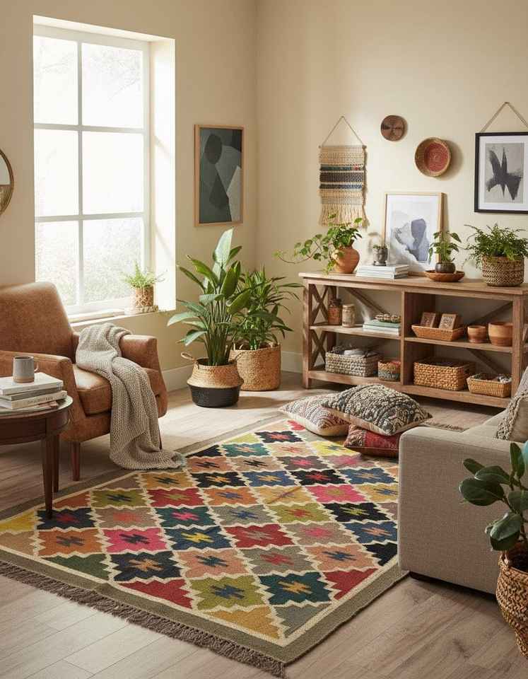 Calm and Earthy Decor Hand Woven Jute-Woolen Kilim Rugs for Living Room Bedroom & Study