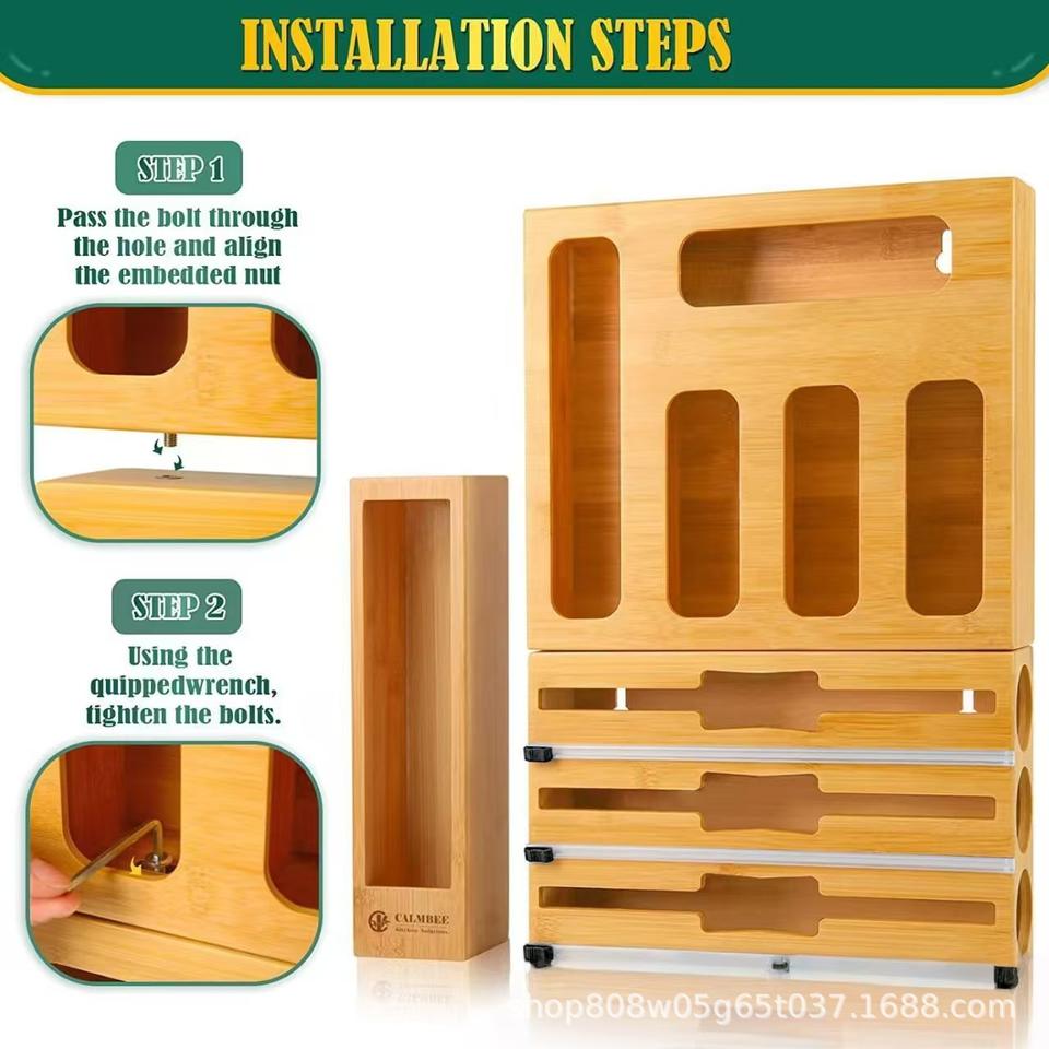 Calmbie Bamboo Food Wrap Dispenser Storage Box For Plastic Foil And Zipper Bags Kitchen Drawer Organizer Rectangle Wood Grain