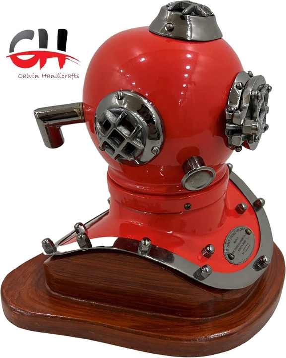 Calvin Handicrafts Red Mini Brass Scuba Diving Helmet Novelty Gifts Decorative Showpiece with Solid Wooden Stand Collectible