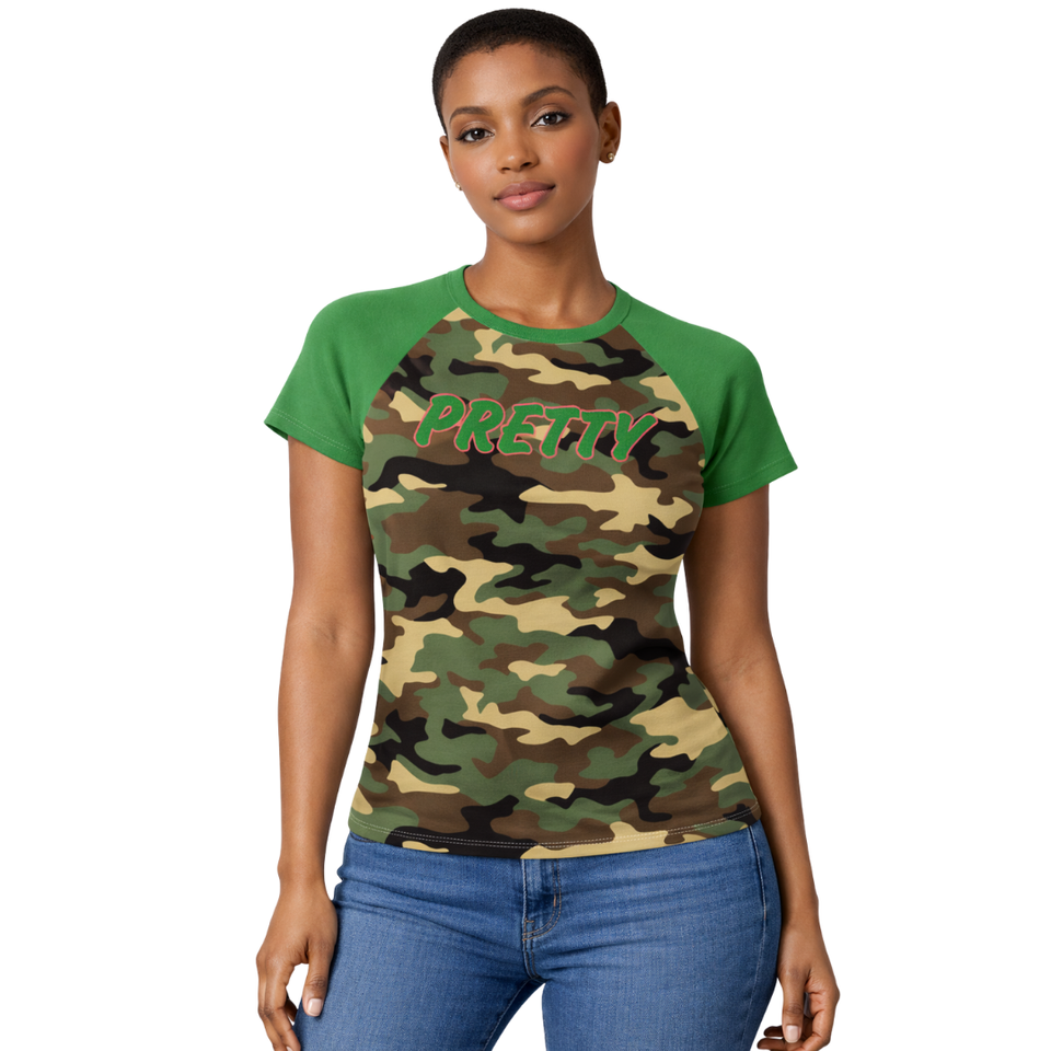 Camo 08 Pretty Girl Raglan Sleeve T Shirt Greek Sorority Apparel Womens Pink and Green College Sisterhood Stylish Greek Wear