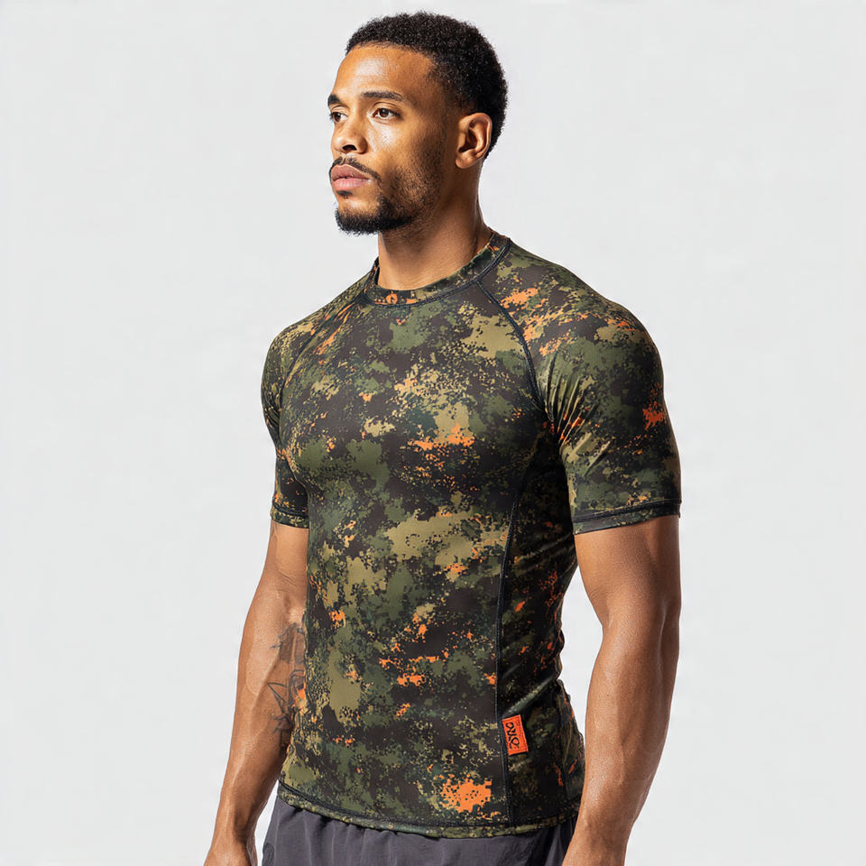 Camouflage Print Base Layer Rash Guard Men's 100% Polyester Compression Print Rash Guard Mens Short Sleeve Camo Fitness Tops