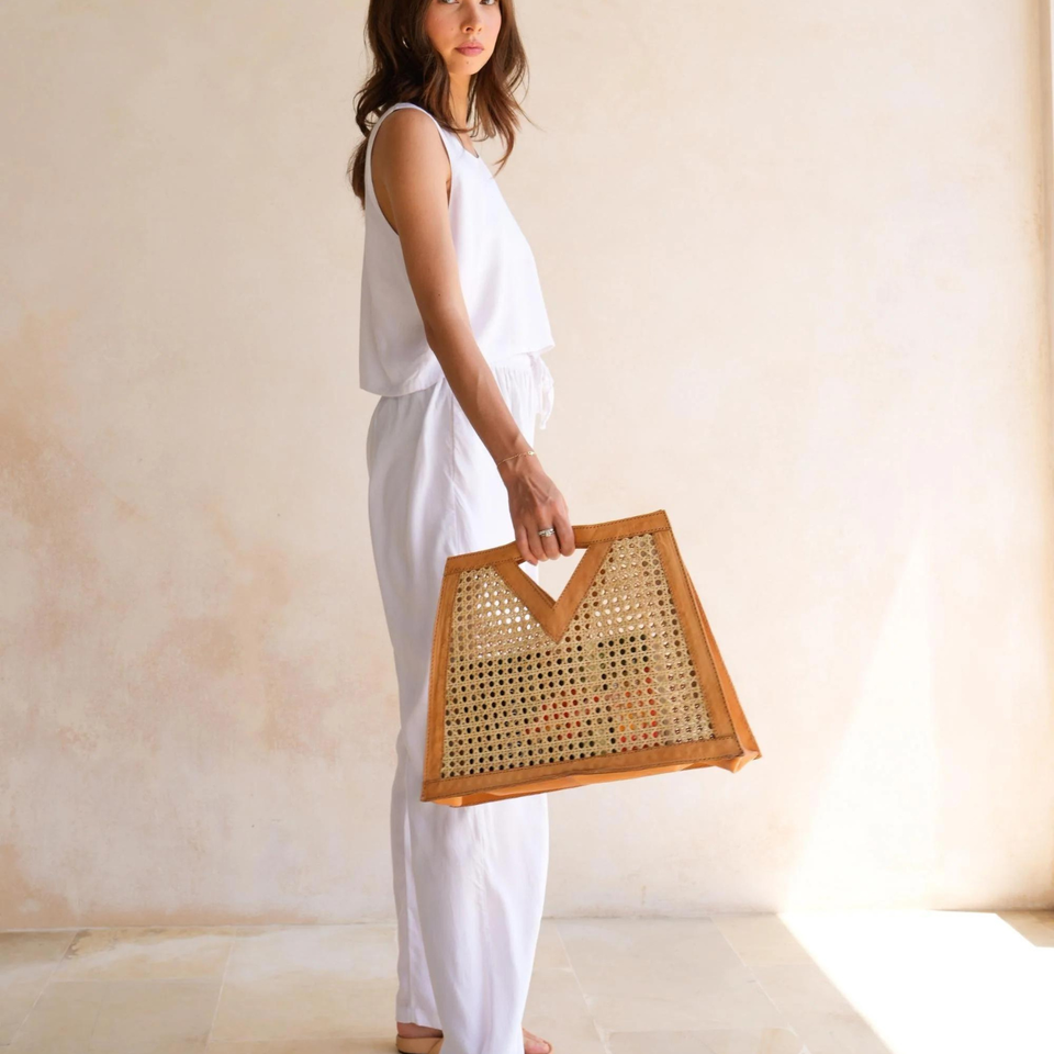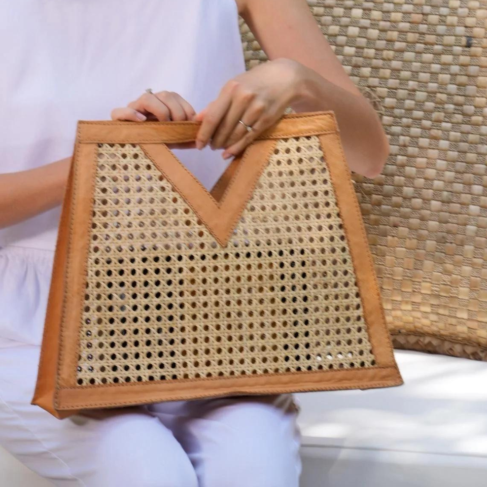 Cane and Leather Bag Women's Straw Large Capacity Shopping Tote Bag Travel Beach Bag with Lining OEM Made in Vietnam