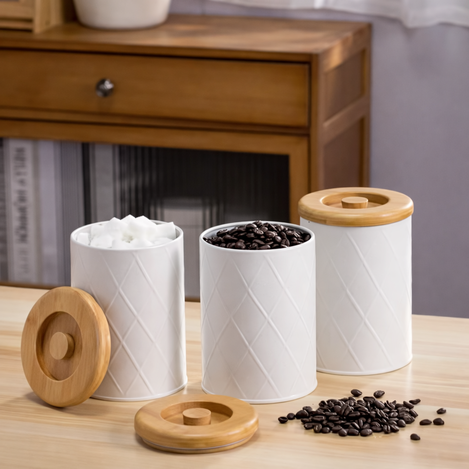 Canister Set Colored Printed Stainless Steel Kitchen Metal square Sugar Tea & Coffee Canister Storage Jar Box Wooden Lid
