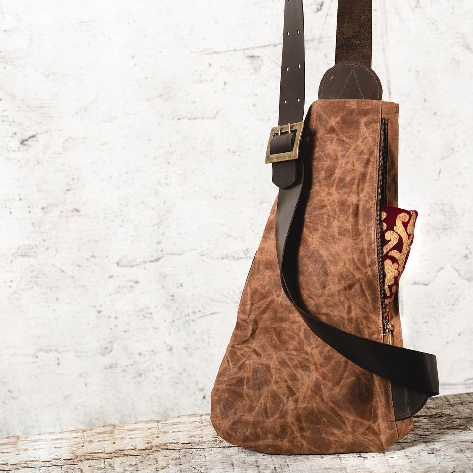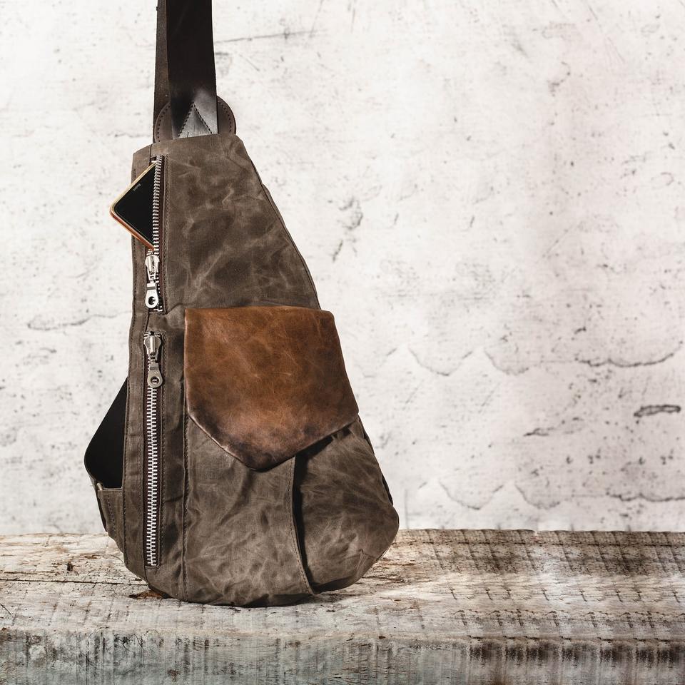 LCSB-0009C Vintage Canvas Sling Bag with Leather Trim Wear Over Shoulder Across Front or Back Zipper Closure