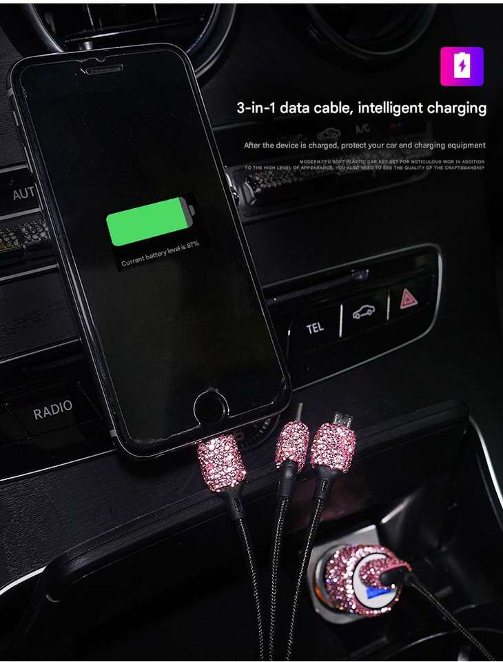 Dual USB Fast Charging Rhinestone Crystal Bling Metal Car Charger with Quick Charger Cable