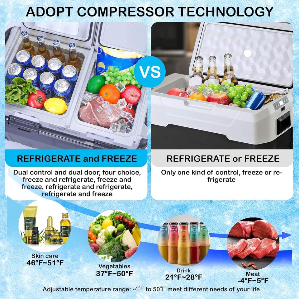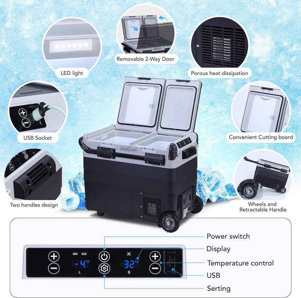Car Fridges 50L 12V 24V 110V 240V AC DC Mini cooler box Camp two zones independent Temperature Control Wheels handle