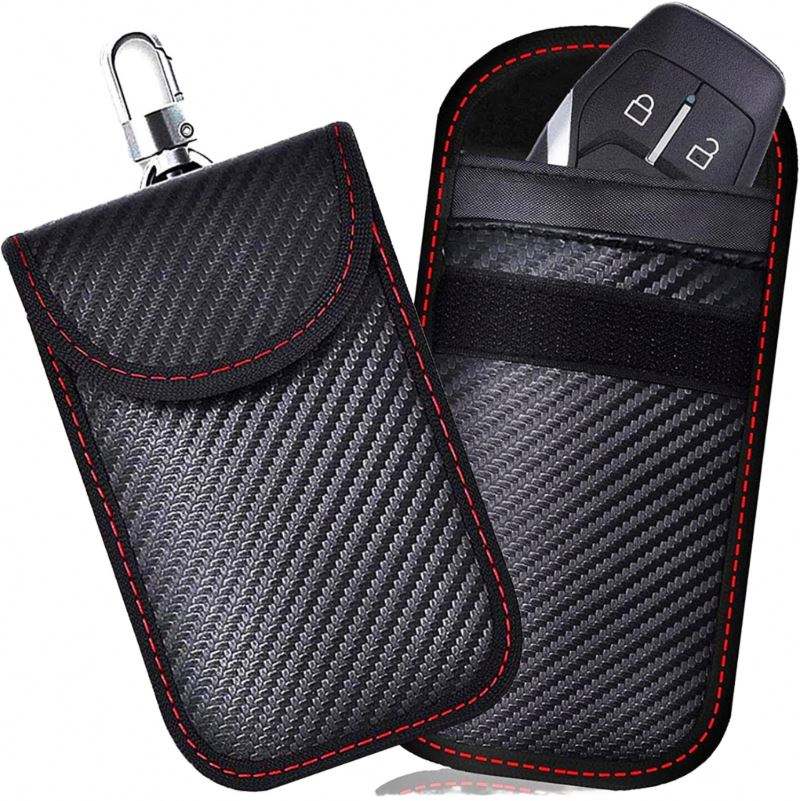 Carbon Fiber Leather Car Key Case with Keyless Theft Protection RFID Signal Blocker Faraday Pouch with Key Hook