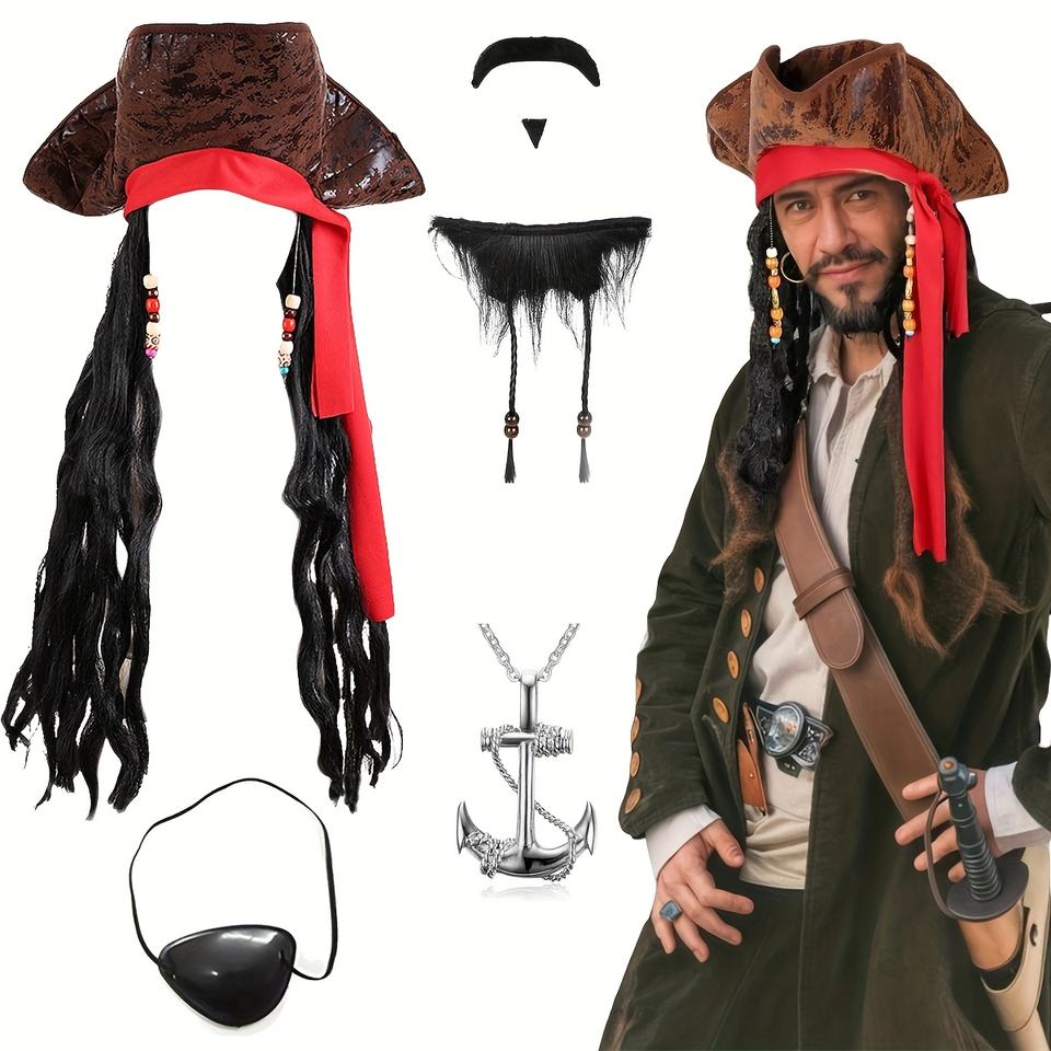 Caribbean Captain Halloween Pirate Costume Set Masquerade Eye Mask Skull Beard Hair Braid Wig for Party Decorations
