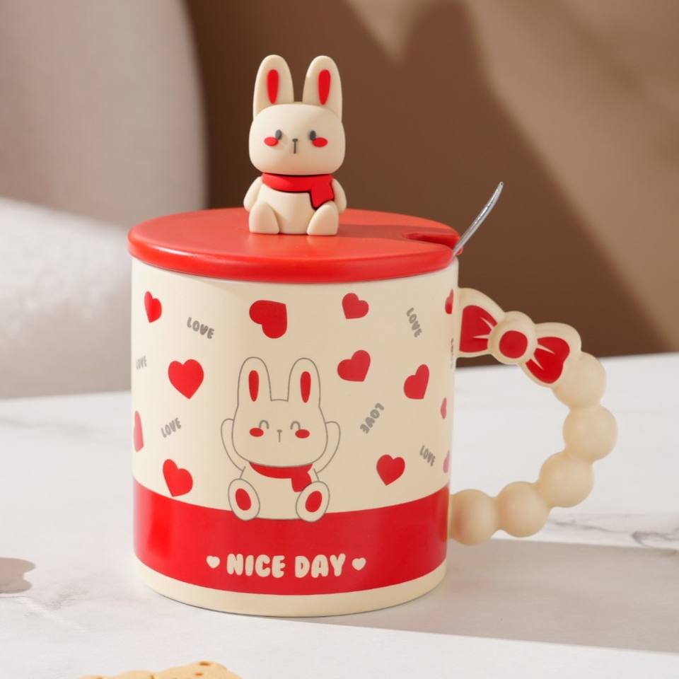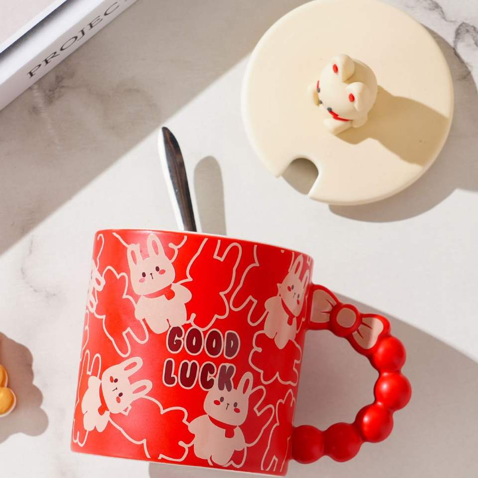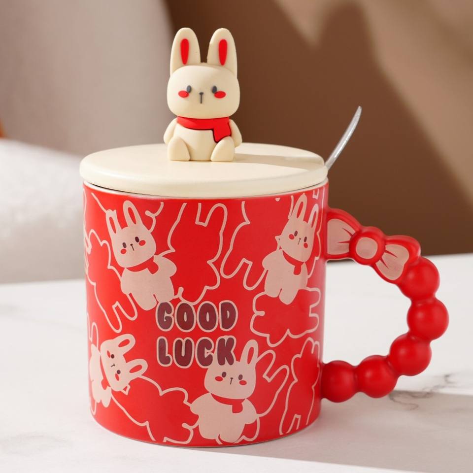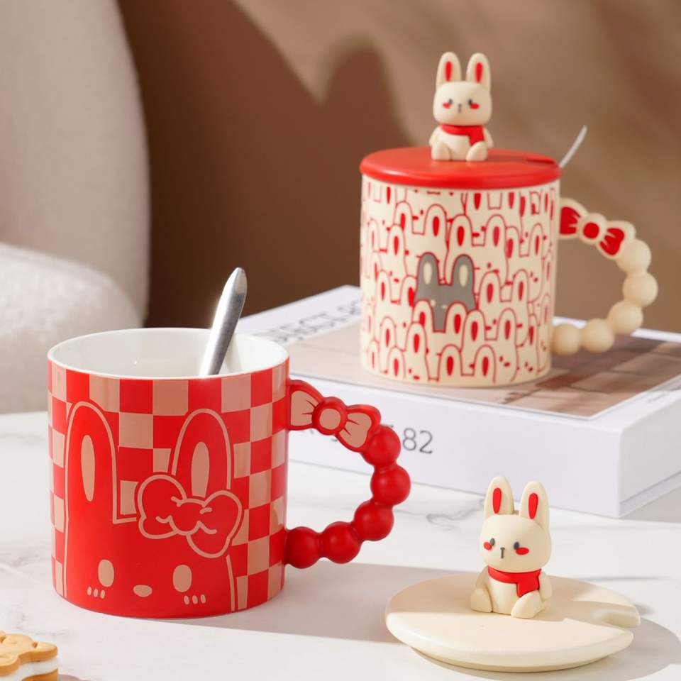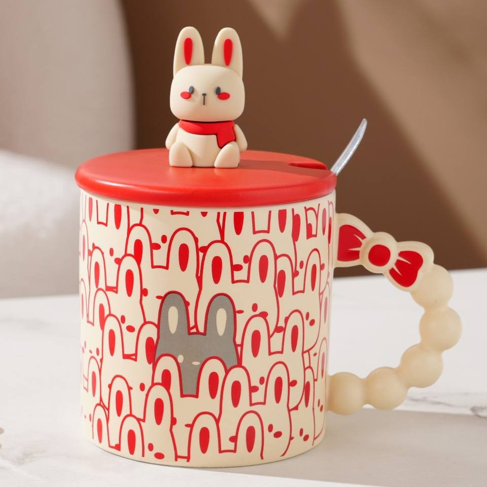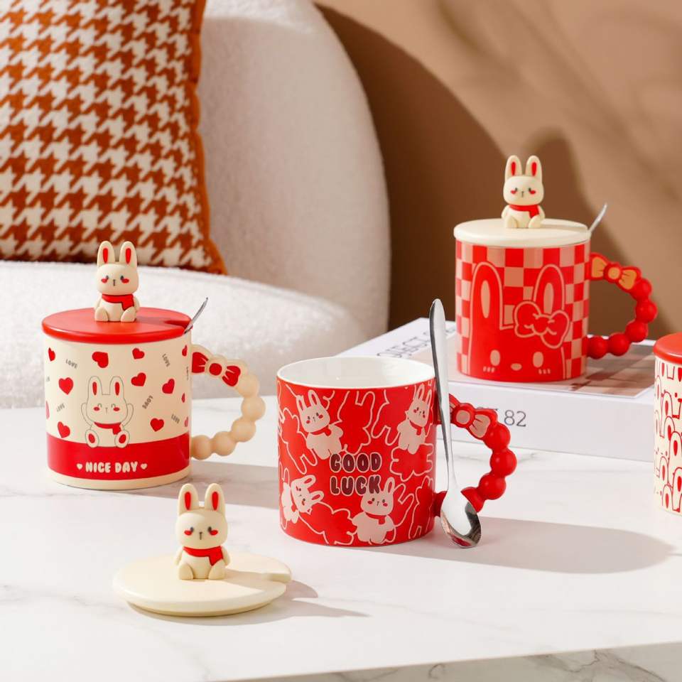Cartoon Animal Cure Rabbit Ceramic Cup Red Commercial with Lid Spoon and String Handles Coffee Cup Set