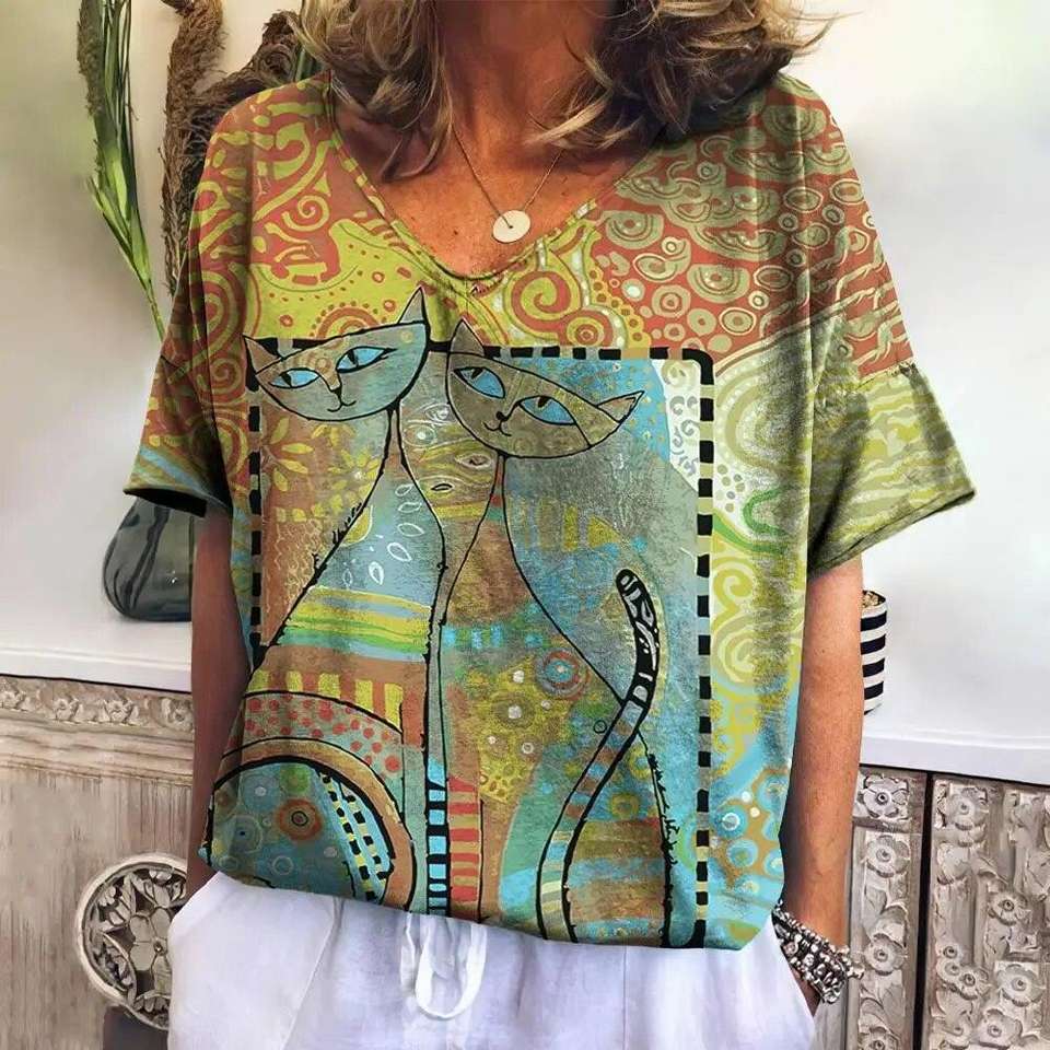 Cartoon Cat T Shirt For Women Summer V-neck Short Sleeve Tee Fashion Female Clothing Street wear Women's T-shirt