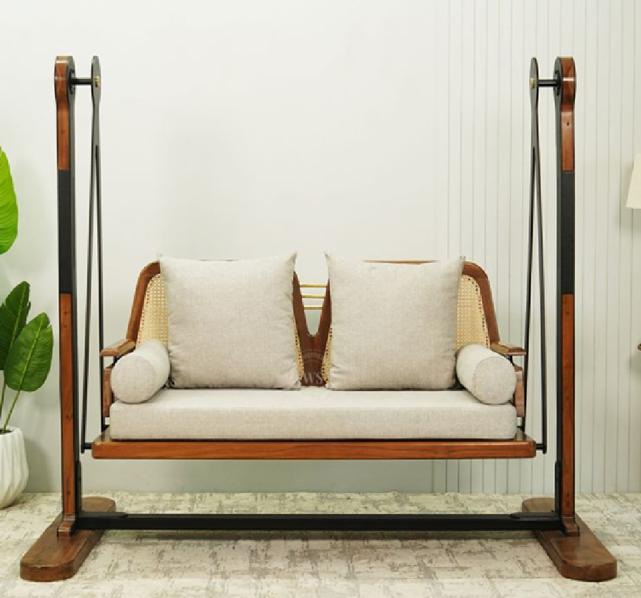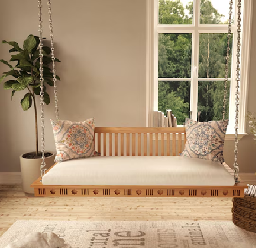 Carved, distressed wooden swing with a velvet cushion. A luxurious indoor statement. Available at wholesale prices