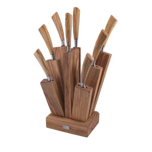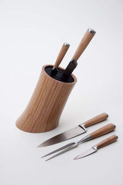 Carved wooden knife holder block with handcrafted details that bring charm and utility to any home cooking space