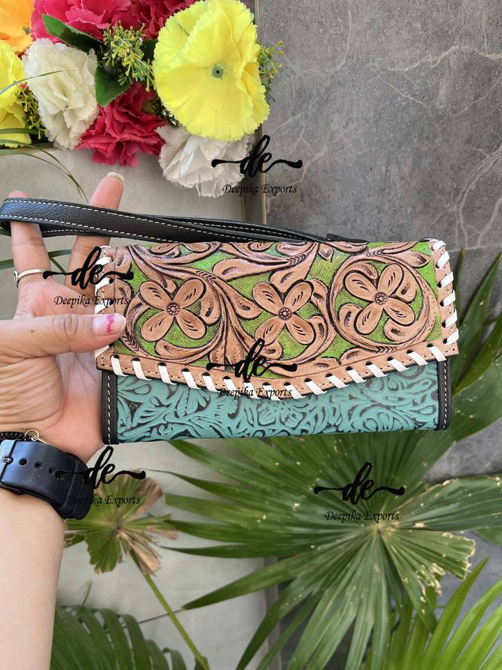 Carving Hand Tooled Wallet Clutch Phone Case Stylish Multi Uses Western Leather Turquoise Color Wallet for Women
