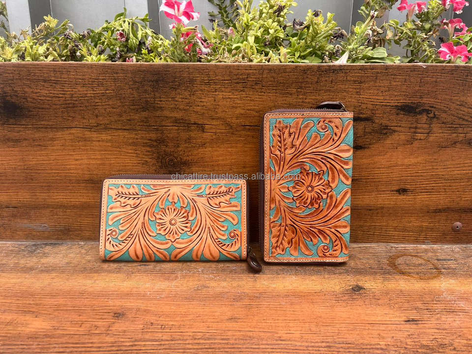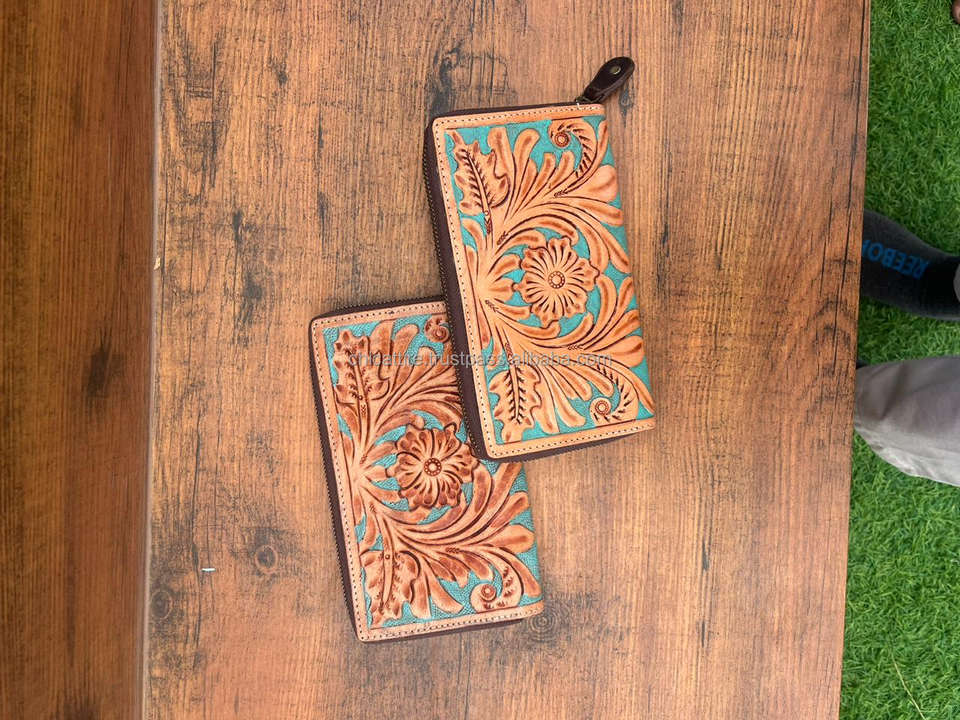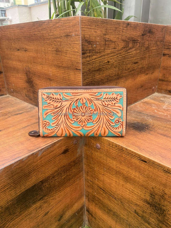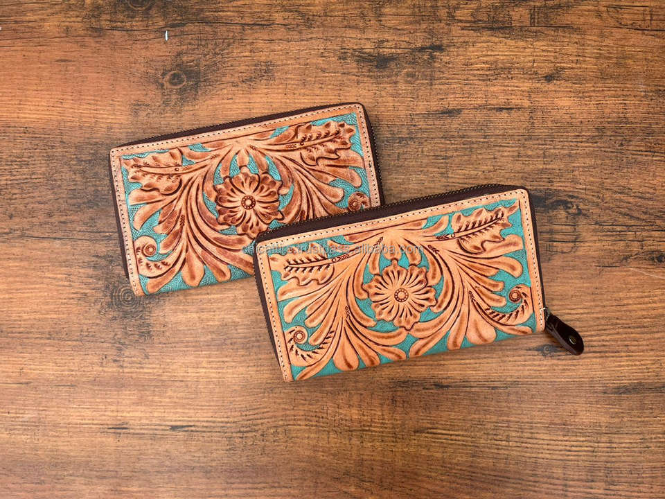 Carving Hand Tooled Wallet Clutch Phone Case Stylish Multi Uses Western Leather Wallets Turquoise Color Wallet for Women
