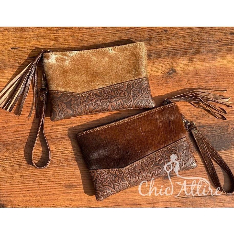 Carving Leather Clutch Cowhide Leather Wristlet Clutch Purse Pouch Wallet Western Patches Hair on Hide Fur Leather Clutch