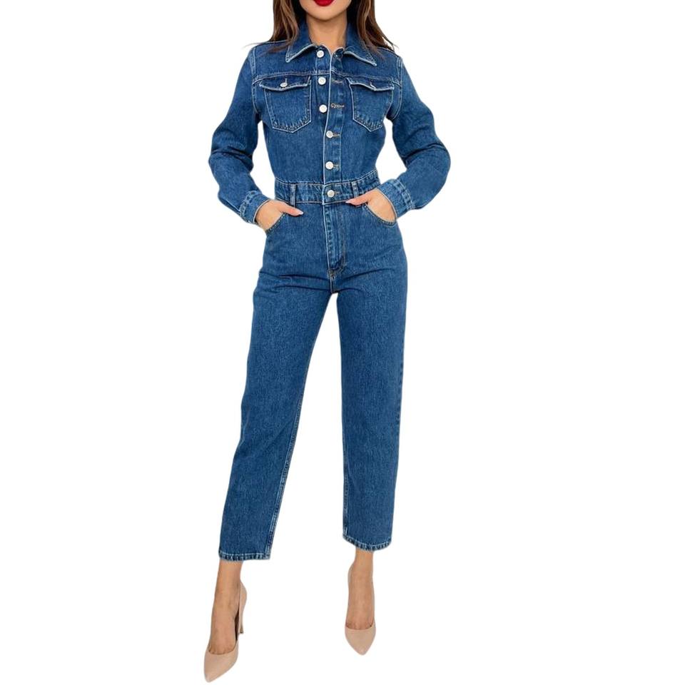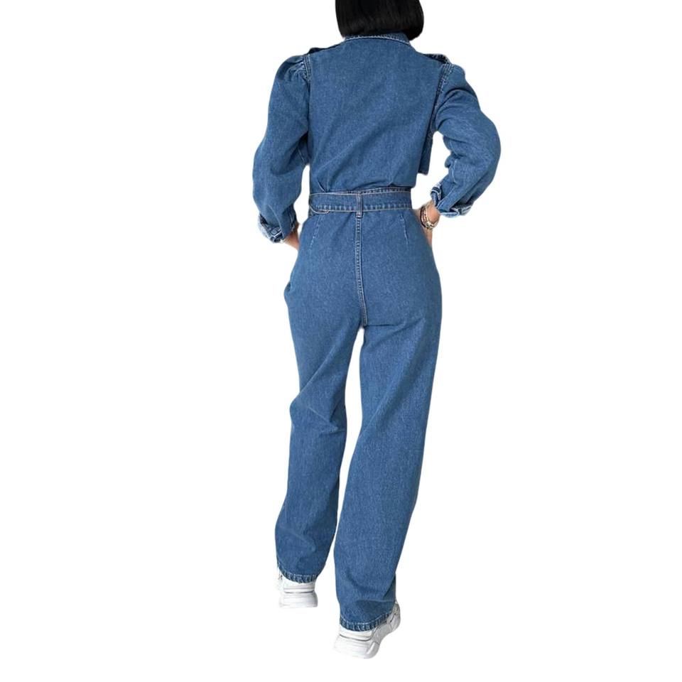 Casual Belt Waist Ladies Jeans Pants Long Sleeve Romper Flap Chest Button Pocket Flared Dark Blue Denim Overalls Women Jumpsuits