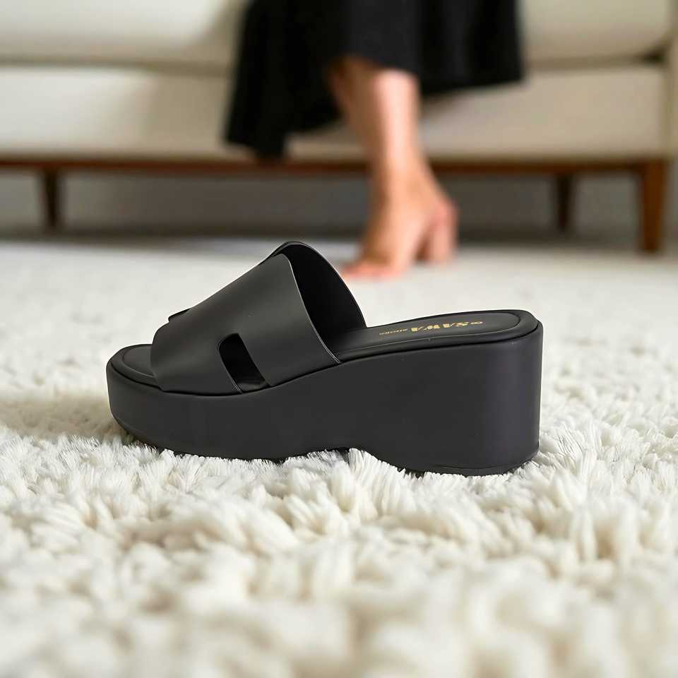 Casual Black 705 BK Wedge Sandals Peep Open Toe Comfortable Flat Ankle Strap Design for Spring Summer Cork Outsole EVA Insole
