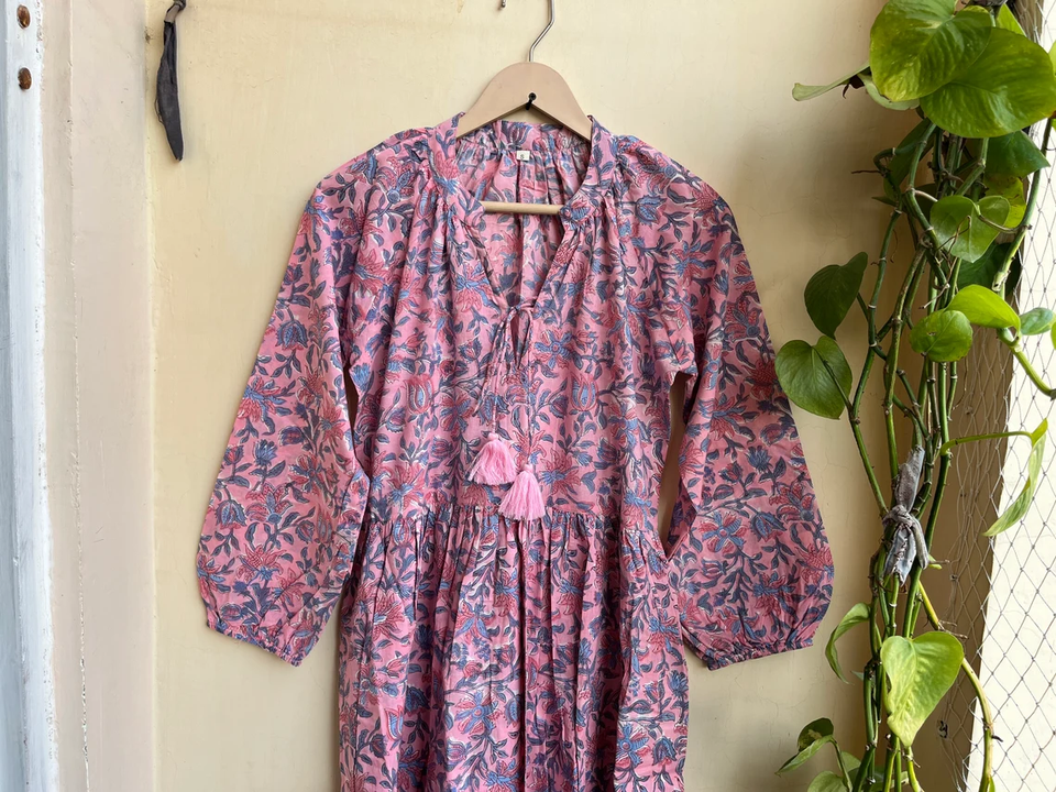 Casual Indian Cotton Long Gown Hand Block Printed Floral Embroidered Maxi Dress with Long Sleeves and Tunics for Women