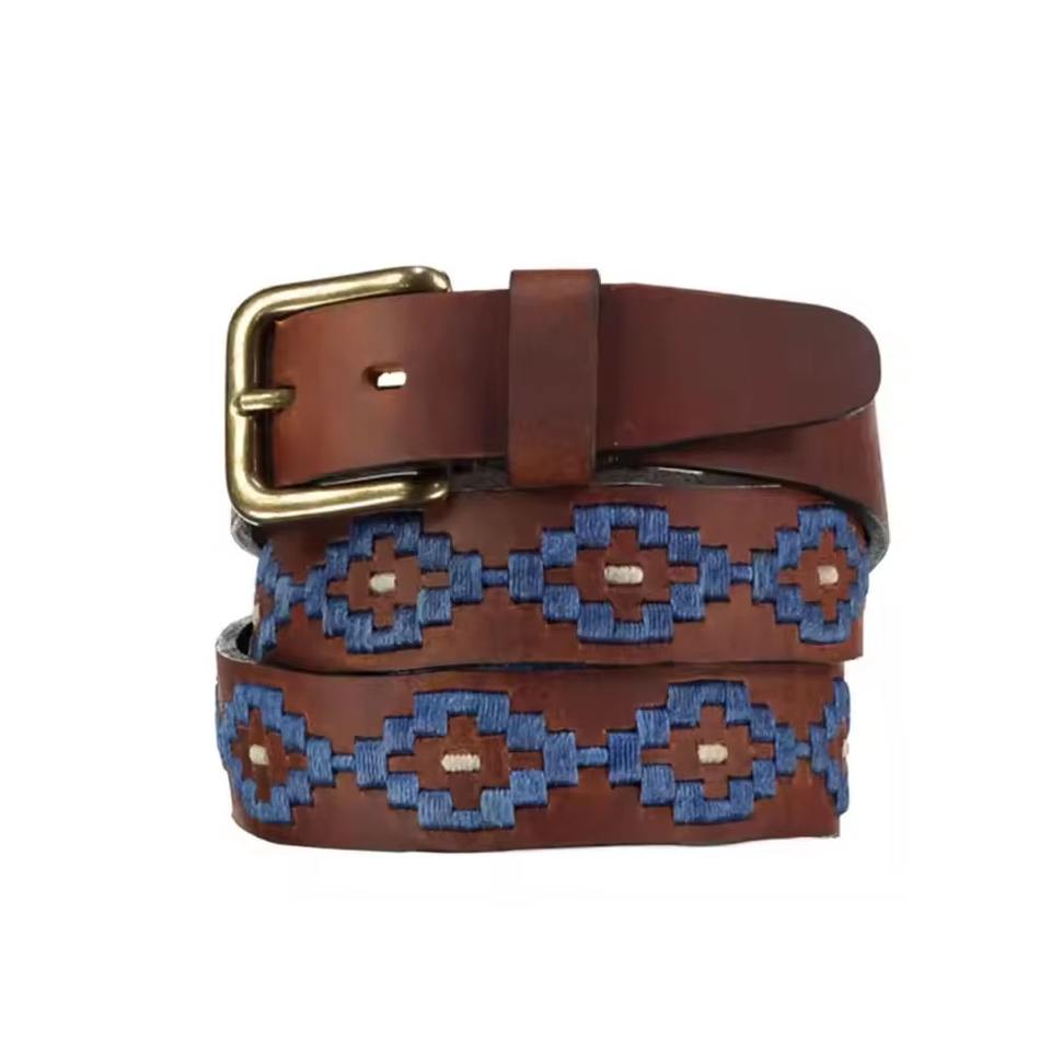 Casual Modern Urban Equestrian Style Polo Belt Black and White Embroidered with Traditional Gaucho Pattern Cow Hide Material